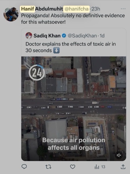 When Sadiq Khan shared a video explaining the health effects of toxic air, Abdulmuhit dismissed it as “Propaganda! Absolutely no definitive evidence for this whatsoever!” — a remarkable claim given that the scientific consensus on the harm caused by air pollution is overwhelming. Newham is one of London’s most polluted boroughs; the health consequences for its residents are not an abstraction.