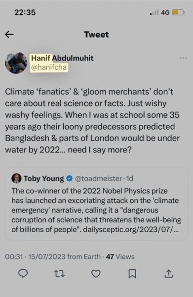 Newham Council has declared a climate emergency and committed to ambitious net-zero targets. Labour nationally has staked significant political capital on its green agenda. A Labour activist publicly aligning himself with Toby Young on climate science is not a minor quirk — it is a meaningful ideological statement.