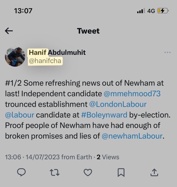 Abdulmuhit’s bitterness towards his former party was on open display in July 2023, when he posted gleefully about Labour’s defeat in the Boleyn ward by-election. “Some refreshing news out of Newham at last!” he wrote, celebrating the victory of independent candidate Mehmood Mirza and describing it as “proof people of Newham have had enough of broken promises and lies of Newham Labour.”